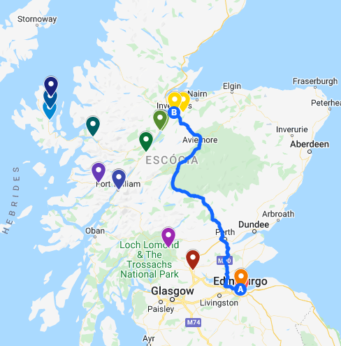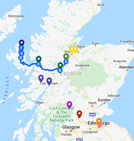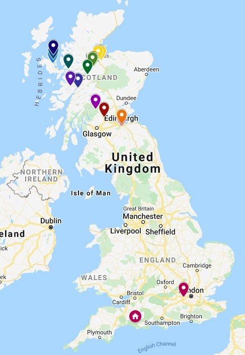 Tivemos 8 dias para rodar umas 1.700 milhas (o que dá uns 2.735 Km) percorrendo da parte sul de Somerset até as Highlands na Escócia, com diversas paradas no caminho.