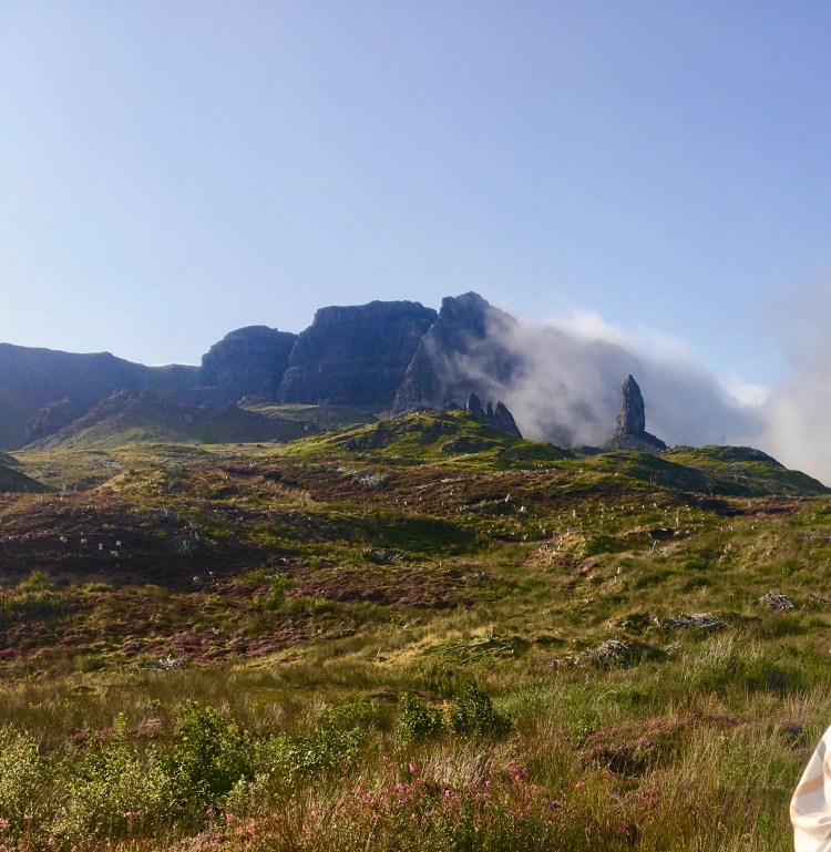 Começamos pelo The Old Man of Storr ou The Storr, paramos o motorhome num estacionamento bem próximo e seguimos uma pequena trilha a pé. Apesar de ser verão, o tempo não estava ajudando muito, mas a formação rochosa e a vista são bem bonitas.