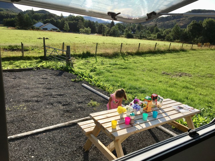 Continuando o caminho de volta, seguimos para nosso último camping o Immervoulin Caravan and Camping Park. Esse lugar foi uma grata surpresa. Não esperávamos muito, pois não tinha estrutura de banheiros e restaurantes como nos primeiros campings, mas já estávamos habituados ao nosso veículo-lar e não sentimos muito diferença. Por outro lado, o lugar fica a beira de um riacho, cercado por montanhas, com natureza em todas as partes. Foi incrível! Conseguimos retomar nosso querido churrasquinho e curtir bastante o ambiente.