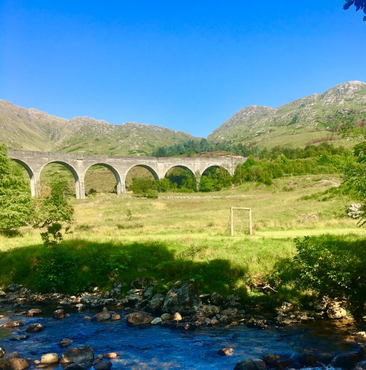 Ainda na atmosfera Harry Potter, seguimos para o Viaduto de Glenfinnan, que é rota do “Jacobite Steam Train” e também apareceu nos filmes. O lugar tem um gracioso riacho e uma arquitetura lindíssima. Ainda conseguimos ver o trem passando por lá!