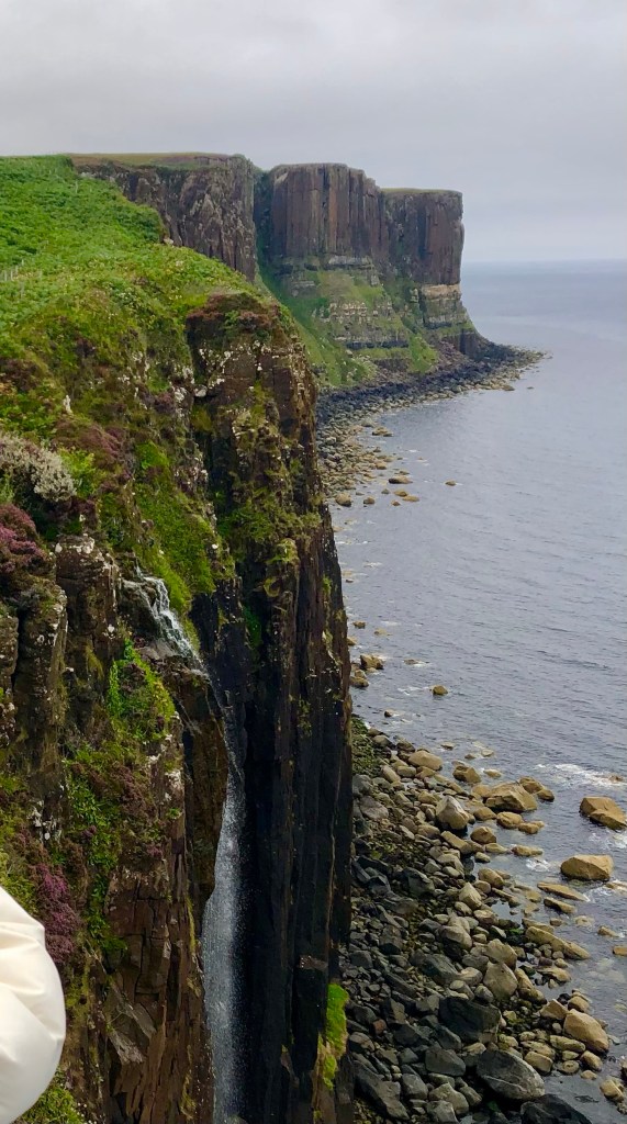 Bem próximo dali, fomos ao Kilt Rock e Mealt Waterfall. Também conseguimos chegar até lá de motorhome. Haviam vários outros também e estacionamento apropriado para esse porte de veículo (isso foi bem comum em diversos pontos turísticos). A paisagem é lindíssima, me surpreendeu mais do que The Storr. Uma cachoeira cai direto no mar, a Mealt Waterfall, e uma linda formação rochosa de pano de fundo, o Kilt Rock, que lembram os tradicionais “kilts” escoceses.