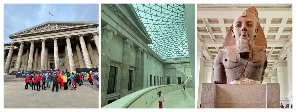 O museu possui uma arquitetura muito bonita, desde a entrada até um lindo teto no átrio “Great Court”. Há exibições de diversas peças egípcias e a mais famosa é a “Roseta Stone” ou Pedra da Roseta, conhecida como a pedra mais famosa do mundo, porque foi fundamental para tornar possível a “tradução” dos hieróglifos egípcios. O museu também abriga um acervo de peças que foram “roubadas” do Partenon em Atenas e até hoje são motivo de disputa diplomática entre Reino Unido e Grécia.