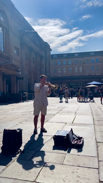 Você pode seguir pela Stall Street passando pela York Street até chegar na lateral da The Romans Bath. Logo à esquerda, você entrará numa charmosa passagem para a Abbey Churchyard e chegará numa pequena praça onde muitos músicos se apresentam.