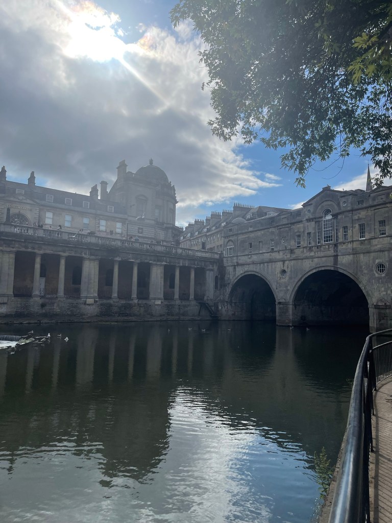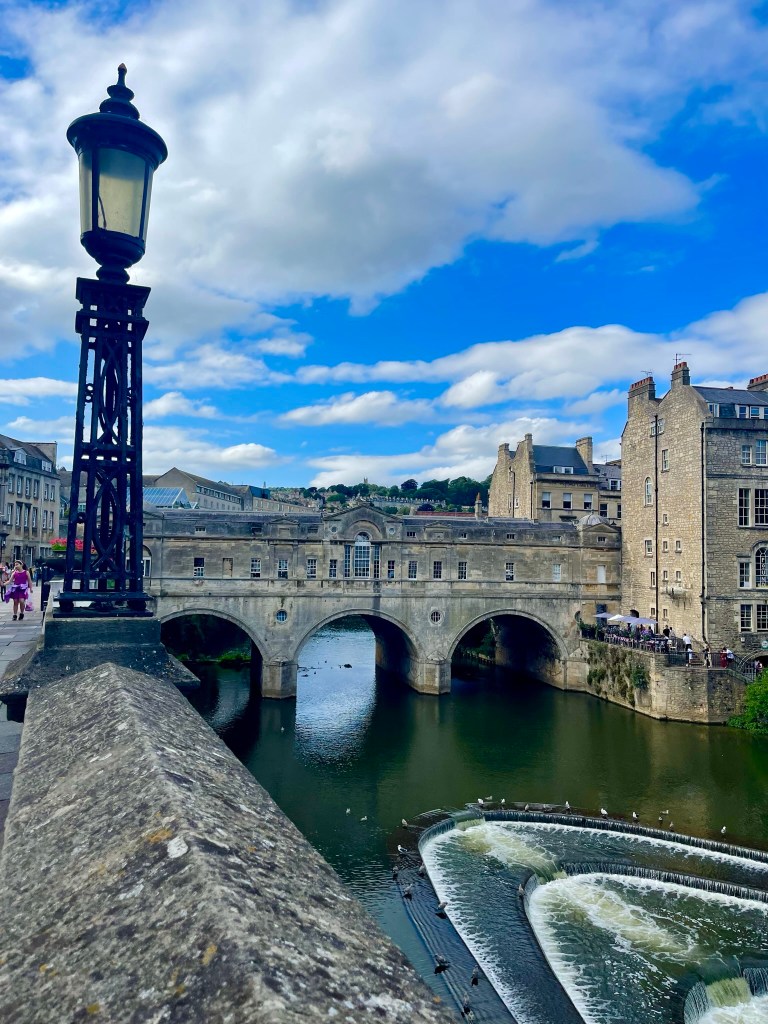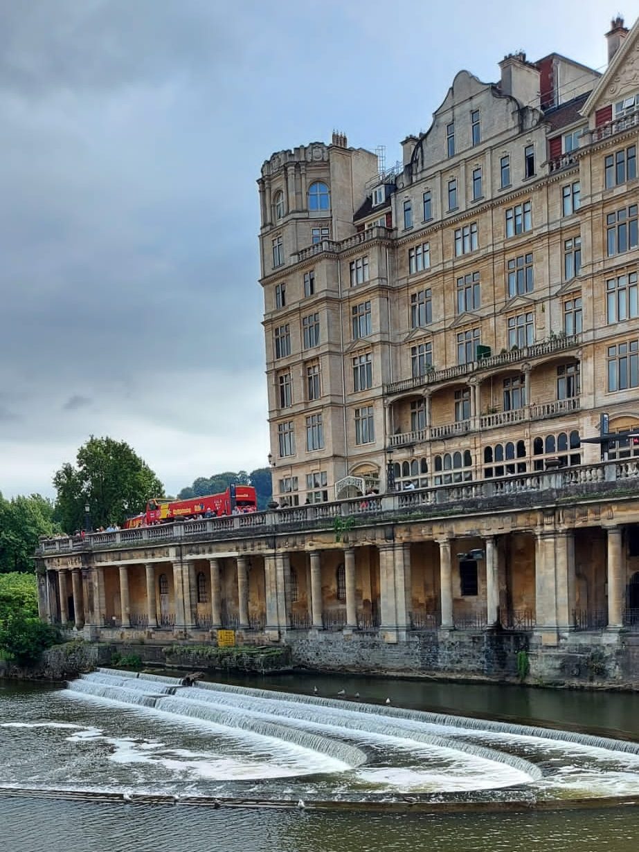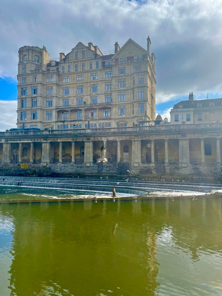 Depois dos jardins, chegamos à minha parte favorita de Bath: as margens do Rio Avon (margem direita). Daqui, você pode apreciar a Ponte Pulteney , o Açude Pulteney (Pulteney Weir) e lindas construções às margens do rio.