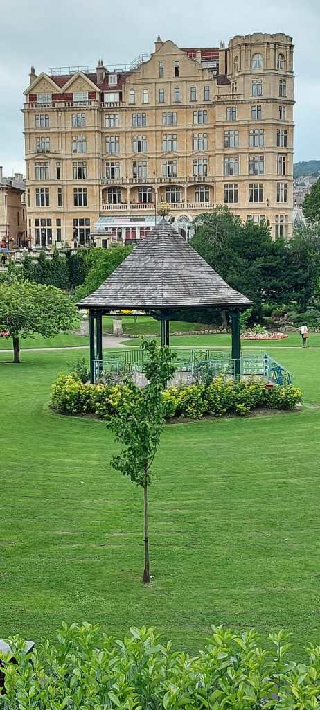 Continuando sua caminhada pela North Parade Passage, você cruzará com a Fonte de Pieroni e já terá uma linda vista para o Parade Gardens. Pela lateral, é possível ver você os jardins de cima com seu lindo coreto no meio. Você pode entrar no parque, pagando uma quantia simbólica de £2, duas libras (confirme no site), e passear pelo lindo gramado dos jardins.