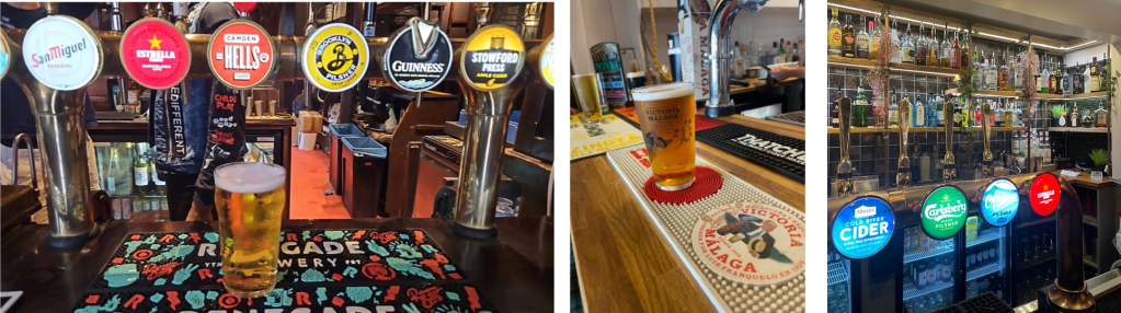 Também é comum encontrar cervejas artesanais produzidas localmente, incluindo marcas exclusivas do próprio pub ou de cervejarias da região.